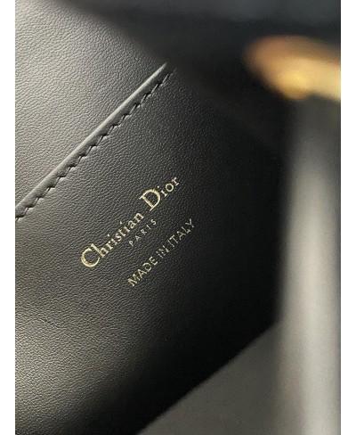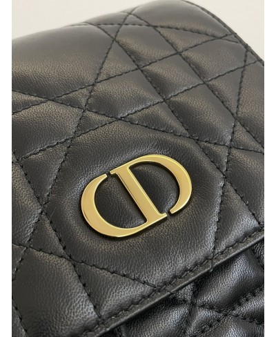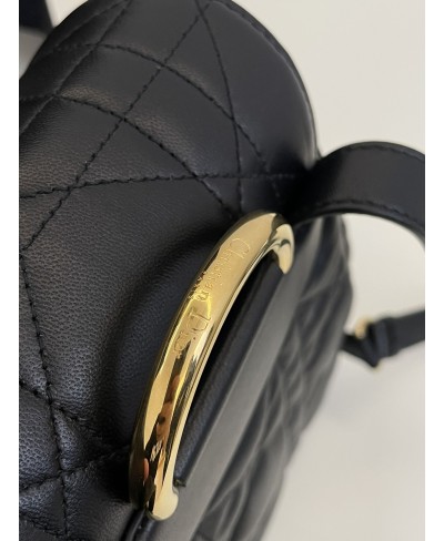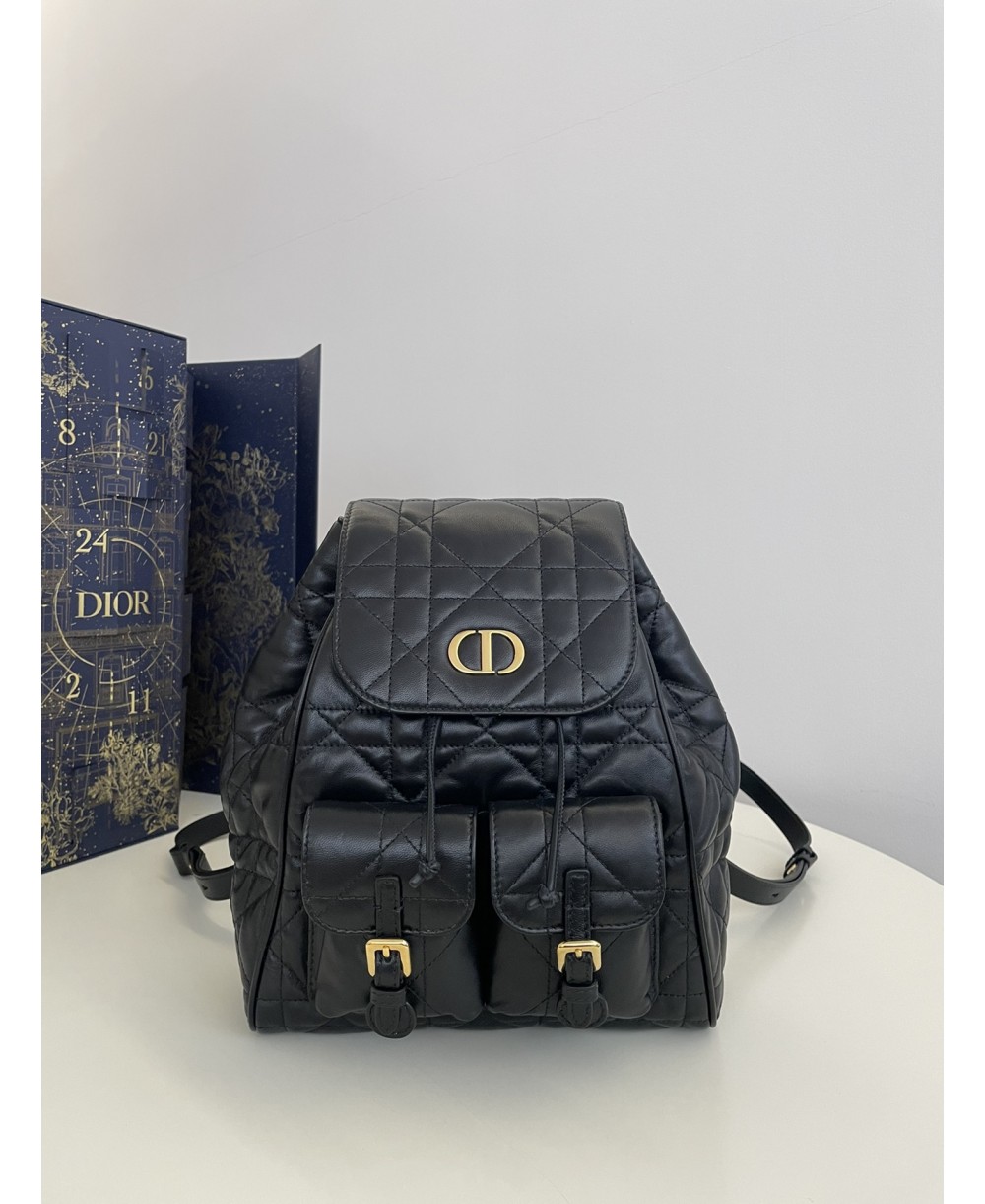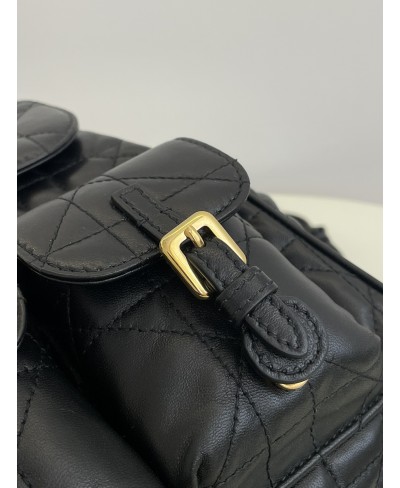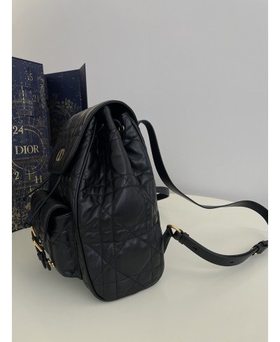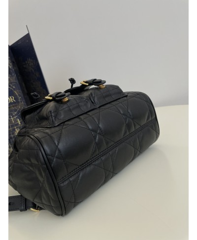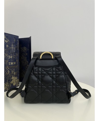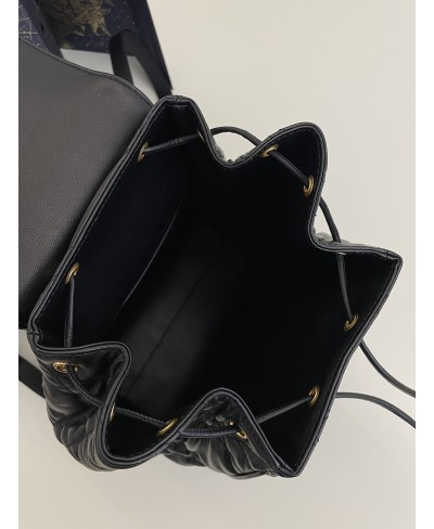The Dior Caro backpack embodies modern and elegant style. Crafted in black lambskin elevated by Macrocannage topstitching, the design features a flap adorned with an antique gold-finish metal CD signature that opens to reveal a spacious drawstring main compartment, while two small flap pockets can hold all the small essentials. The medium backpack has a gold-finish handle and adjustable straps for added comfort.