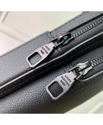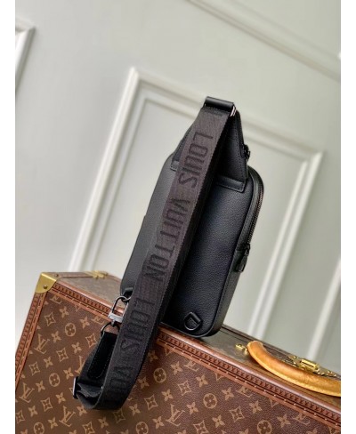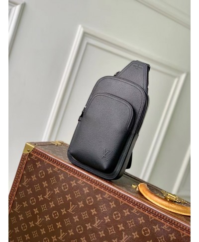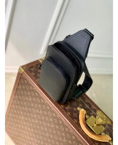 The Avenue Slingbag PM is crafted from waxy calfskin, a leather as durable as it is supple, and adorned with the embossed LV Initials of the LV Aerogram collection. It features a main compartment, a zipped front pocket, and a small zipped triangular pocket. The adjustable strap allows it to be worn on either shoulder.