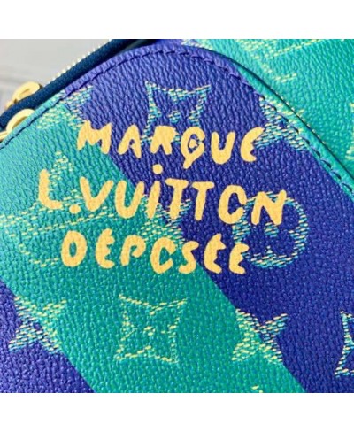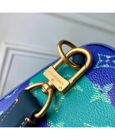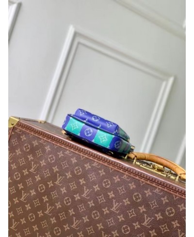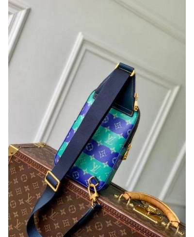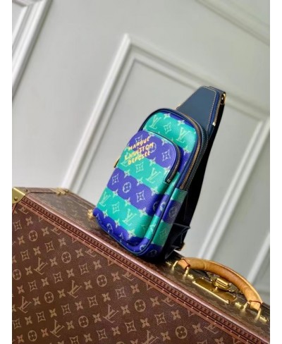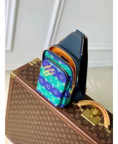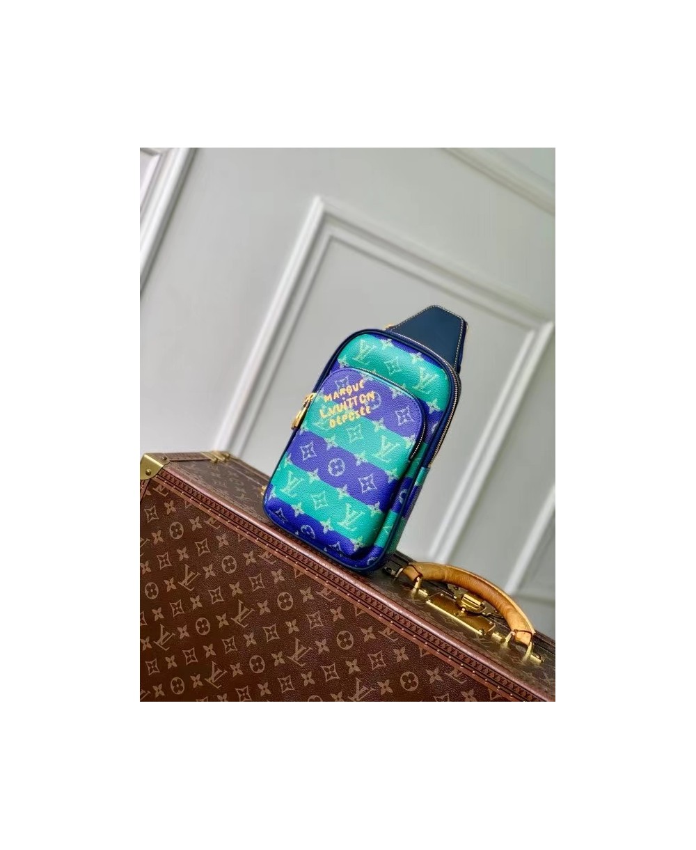 Fashioned from striped Monogram Heritage coated canvas with blue-leather trim, this Avenue Slingbag PM is a practical small bag. This cross-body bag has a zipped main compartment, lined in saffron-colored textile, and a convenient front zipped pocket. For smaller belongings, there’s a triangular pocket attached to the top of the bag where it meets the strap.