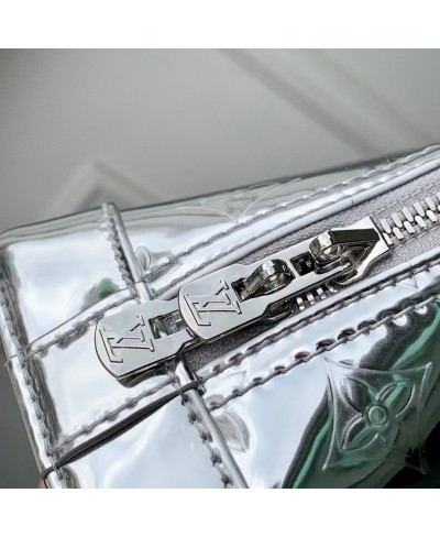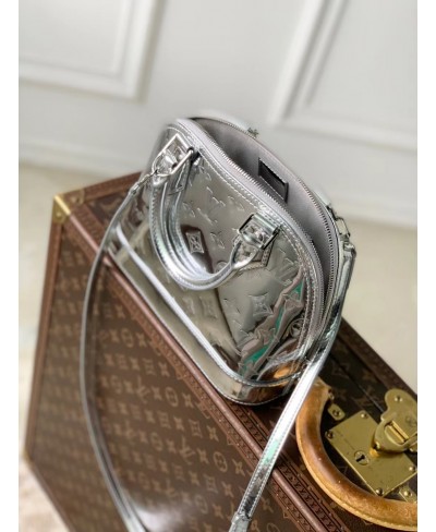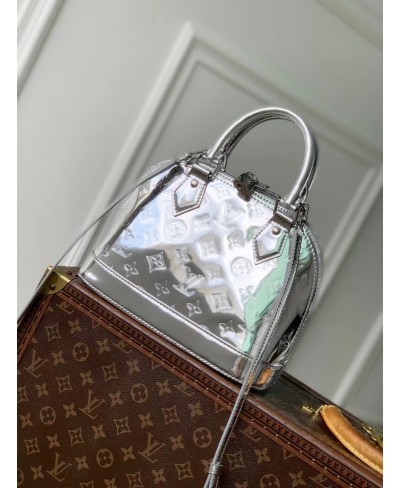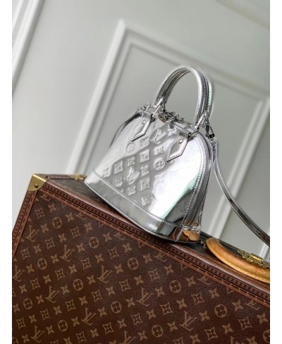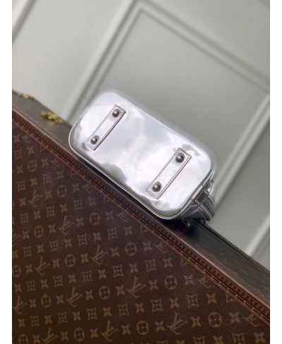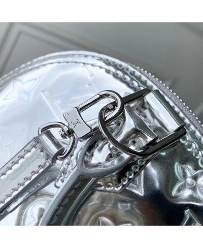 The LV Ski collection introduces technical details this season, and the Alma BB is a shining example with its light-reflecting Monogram Miroir finish. Bringing a retro-futuristic attitude to any look, it is crafted from weather-resistant canvas in an exclusive Silver colorway with matching hardware. It is adorned with a signature LV padlock, and includes a removable shoulder strap.
