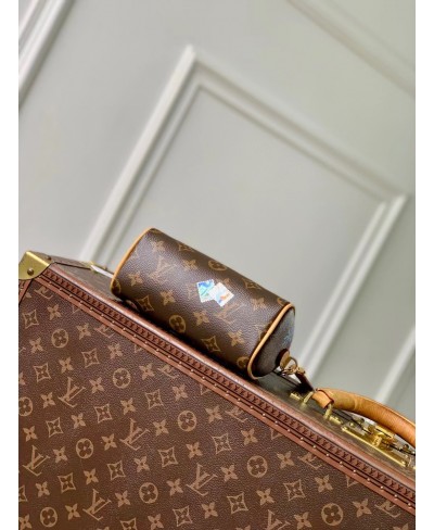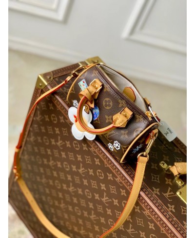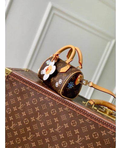 This colorful edition of the Nano Speedy stars the House’s iconic mascot Vivienne. Crafted from signature Monogram canvas, the playful design is decorated with illustrations and includes a Vivienne charm. It is trimmed with leather and is finished with gold-toned hardware for a sophisticated finishing touch.