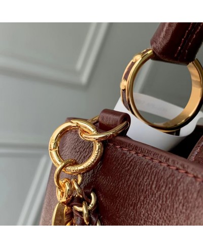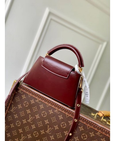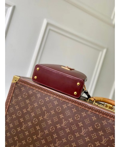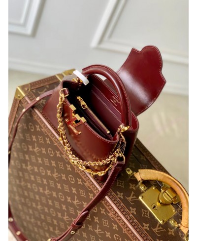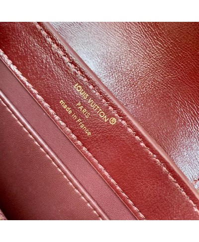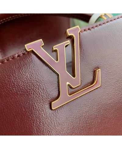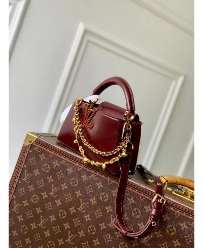 This Capucines East-West Mini showcases a unique and rich Grenat Red colorway, inspired by the Louis Vuitton Beauty collection. The iconic double-carry style is crafted from crinkled leather for a fashion-forward take and is elevated with gold-toned LV Initials. This edition also features two decorative chains, which can be removed if desired.