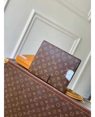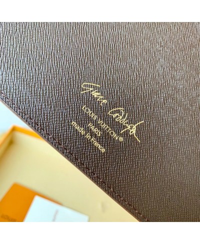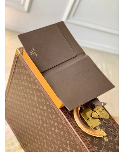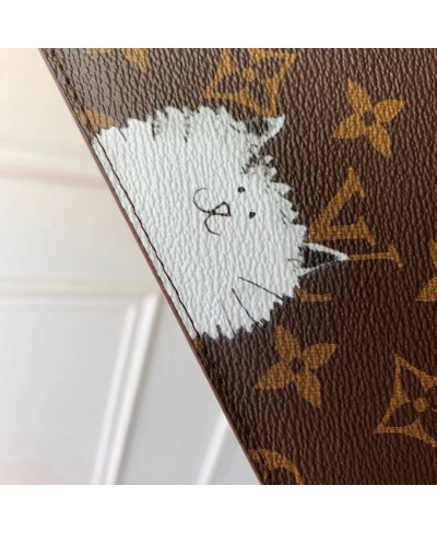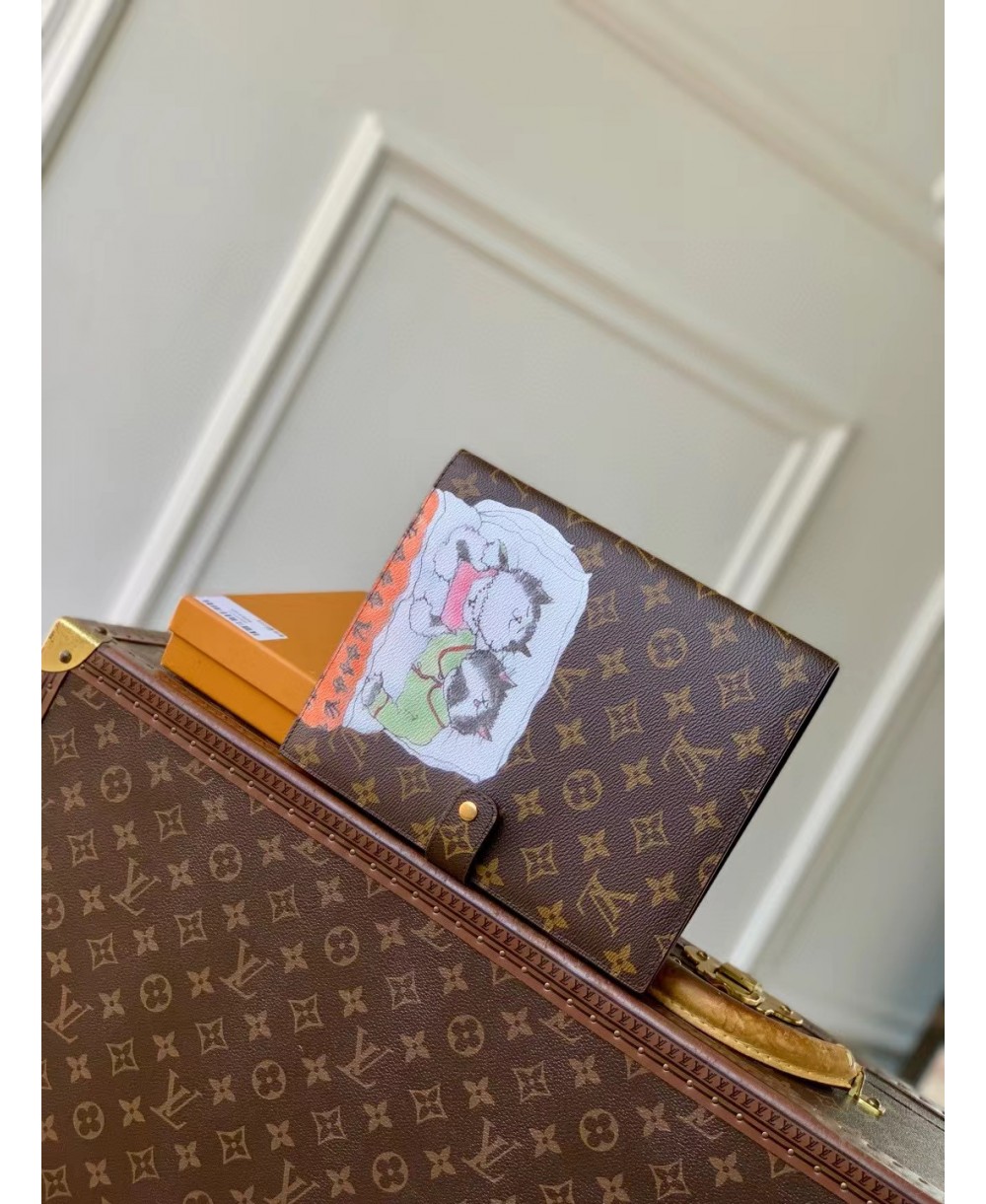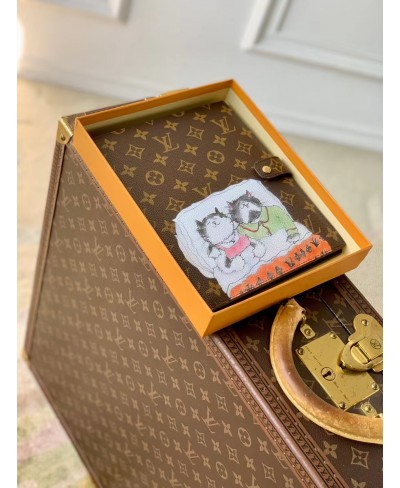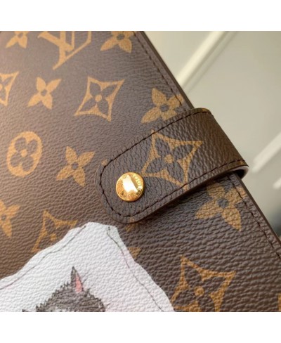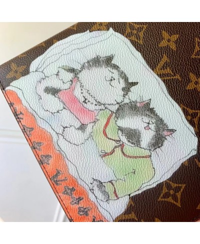 The desk agenda cover from the Travel With capsule is a humorous essential for cat lovers. The outside is clad in elegant Monogram coated canvas, with an illustration, from artist Grace Coddington, of pajama-wearing felines. The brown leather interior houses a diary, notebook, or other papers, and it is held secure by a snap closure.