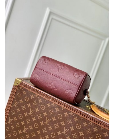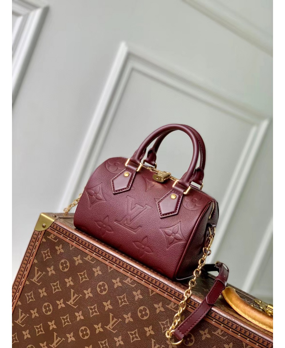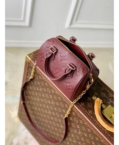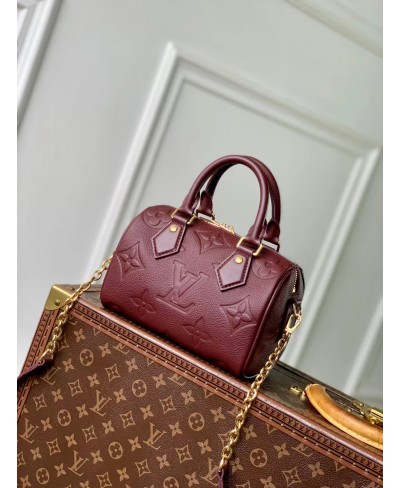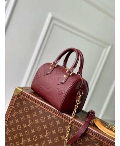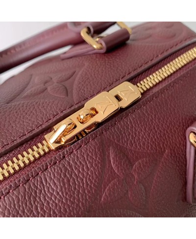 La borsa Speedy Bandoulière 20 è reinterpretata per la Collezione Back to School in pelle Monogram Empreinte color rosso granato. L'elegante modello, indossabile in vari modi, è arricchito da raffinati dettagli in metallo dorato, come l'iconico lucchetto. Le dimensioni compatte consentono di portare con sé tutto l'essenziale, inclusi un libro tascabile e diversi prodotti di bellezza.