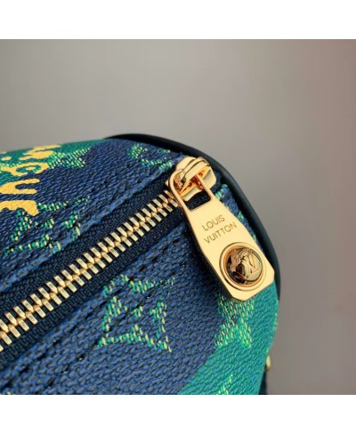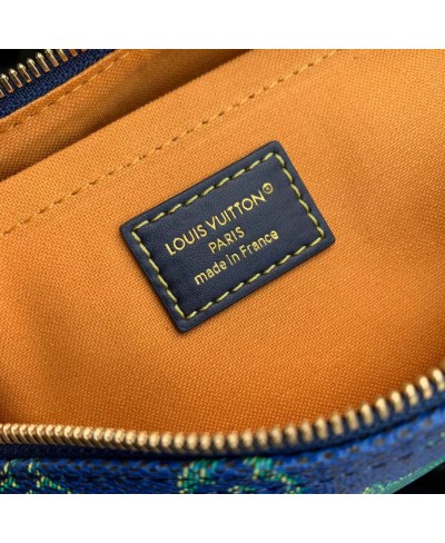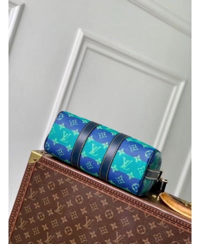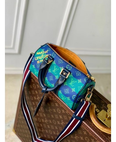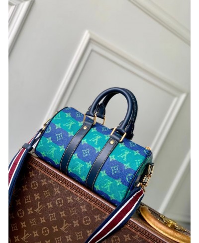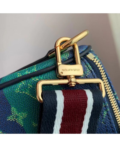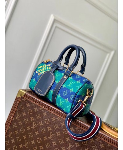 La borsa Keepall Bandoulière 25, perfetta per la città, è realizzata in tela Monogram Heritage. La firma "Marque L. Vuitton déposée", tratta dal primissimo motivo Damier della Maison, aggiunge il tocco distintivo di Pharrell Williams. Il porte adresse con cuciture a contrasto richiama i manici e le fasce laterali, mentre la tracolla amovibile a righe consente varie opzioni di utilizzo.