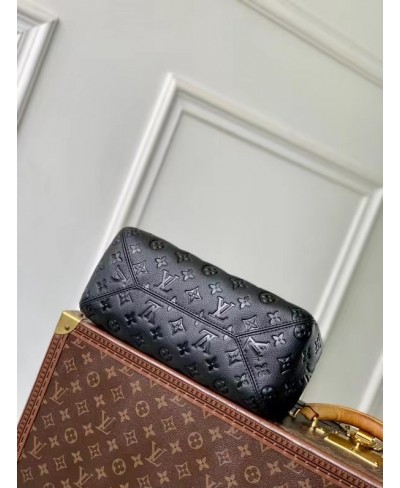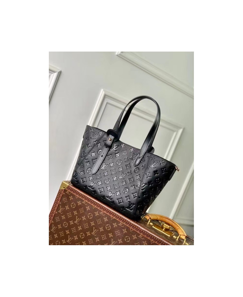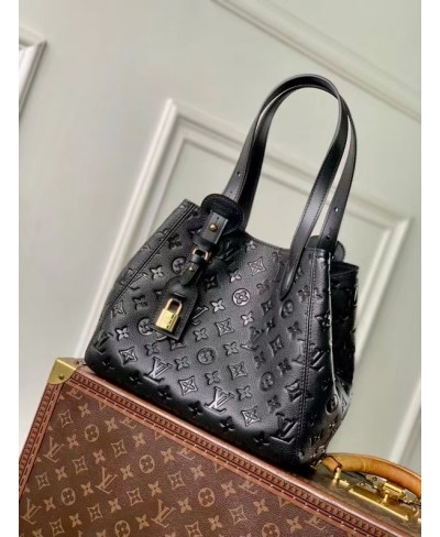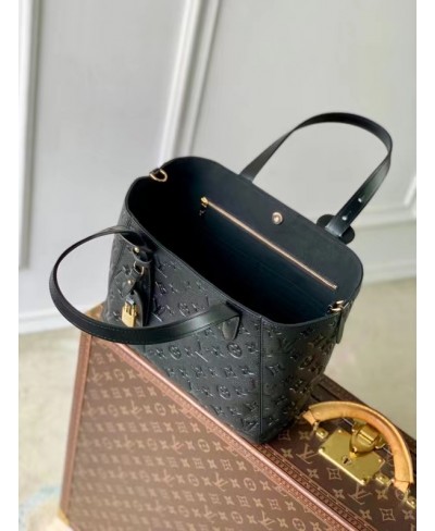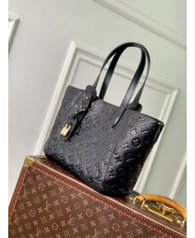 La borsa All In One PM è una nuova creazione dell'omonima linea. L'accessorio, realizzato in pelle Monogram Empreinte con parti metalliche dorate, può essere portato come una hobo rotonda o una tote aperta. L'elegante modello, abbastanza capiente da contenere l'essenziale per tutti i giorni, è arricchito dai dettagli iconici quali il porte adresse e il lucchetto decorativo con iniziali LV.