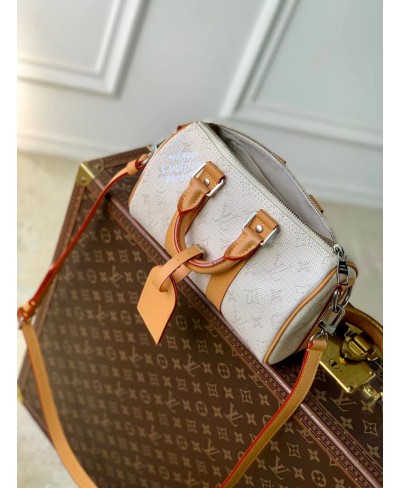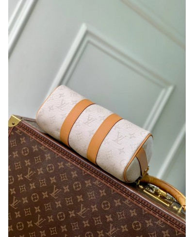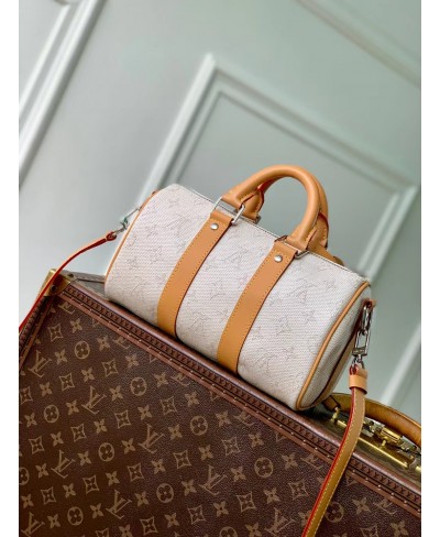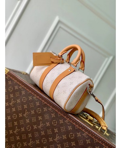 Questa borsa da città Keepall Bandoulière 25 è realizzata in tela rivestita Monogram Heritage, con l'iconica firma "Marque L.Vuitton Déposée". La sua vivace combinazione di colori aggiunge un tocco di stile a qualsiasi outfit. La tracolla rimovibile e regolabile firmata Louis Vuitton permette di indossarla a spalla o a tracolla. L'interno è foderato in cotone colorato.