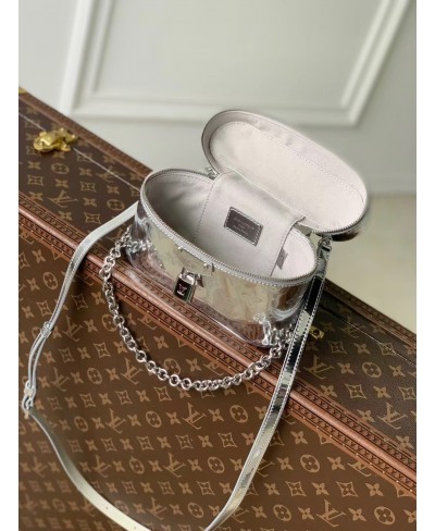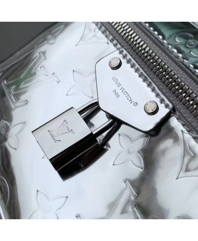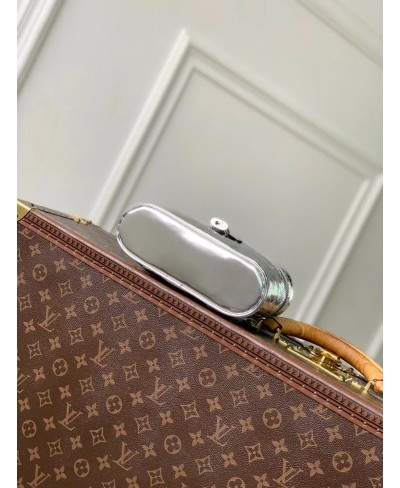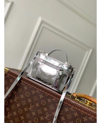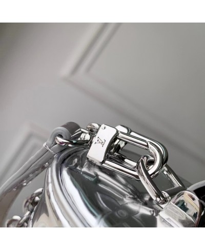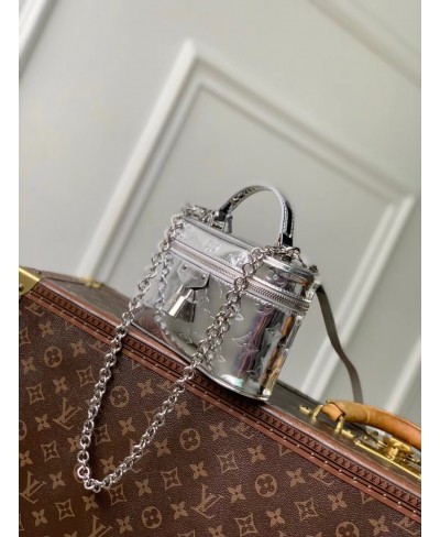 La pochette Vanity con catenella s'ispira ai tradizionali accessori da viaggio che hanno reso celebre la Maison. La versione proposta, parte della Collezione LV Ski, è realizzata in tela Monogram Miroir color argento e impreziosita dal lucchetto coordinato con firma incisa. Il pratico modello, dotato di tracolla amovibile, è perfetto per contenere l'essenziale, come portamonete e occhiali da sole.