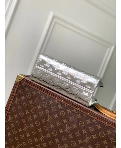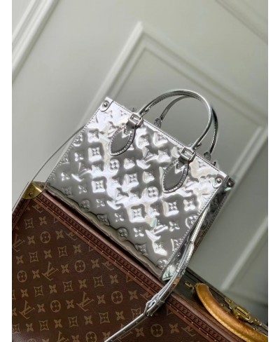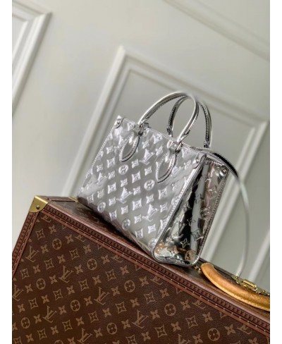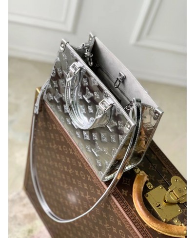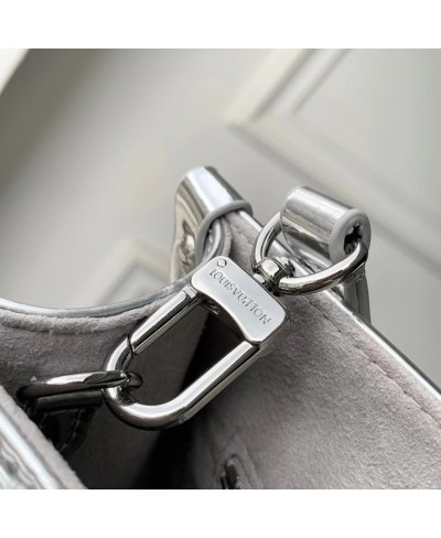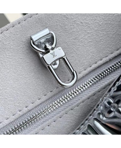 La Collezione LV Ski presenta la borsa OnTheGo PM nella versione con Motivo Monogram Miroir. Realizzata in tela laminata per una maggiore resistenza, viene proposta in un raffinato color argento che cattura la luce, impreziosito da dettagli metallici coordinati. Il design versatile è dotato di molteplici tasche interne e può contenere tutti gli oggetti essenziali quotidiani, incluso un piccolo libro.