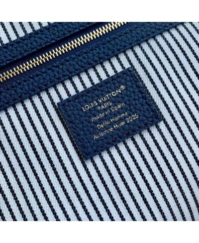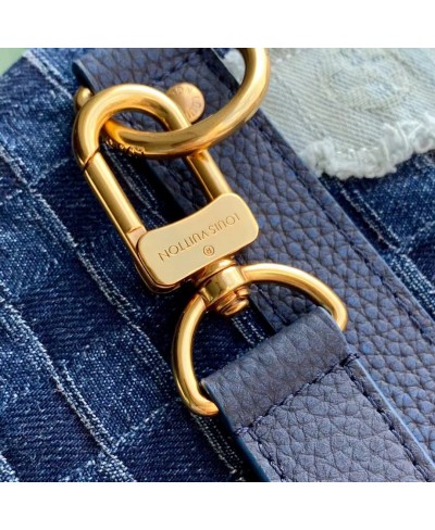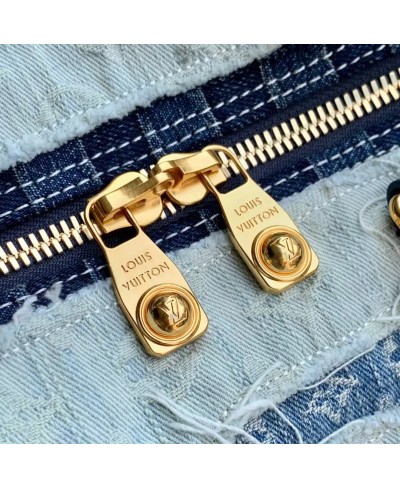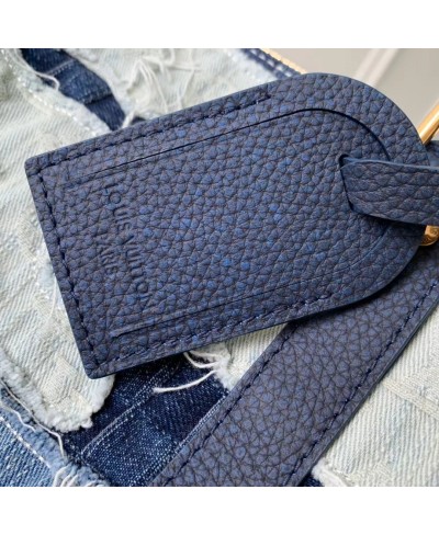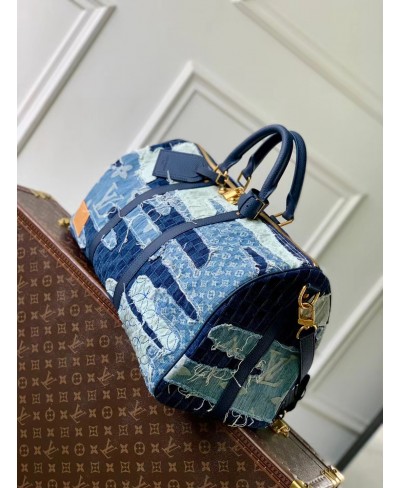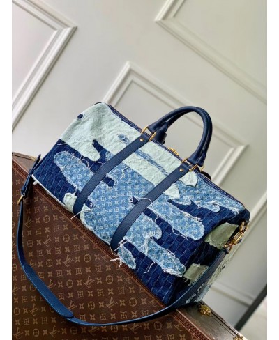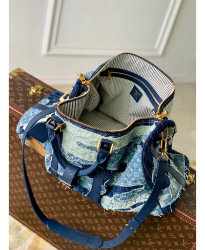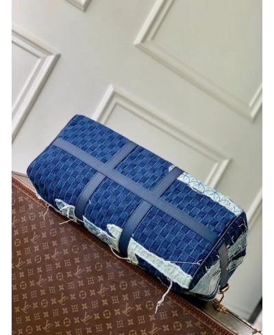 La borsa Keepall Bandoulière 50 è realizzata in denim stone washed con una tecnica ispirata a quella giapponese del Boro, in cui si rammendano ripetutamente i tessuti. La base, caratterizzata dal motivo Damier, presenta dettagli con l'iconico decoro Monogram della Maison. L'accessorio, foderato in cotone a righe, è completato da un'applicazione in pelle che raffigura una carpa.