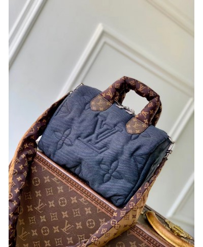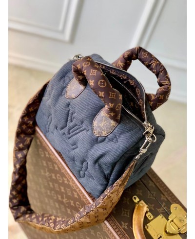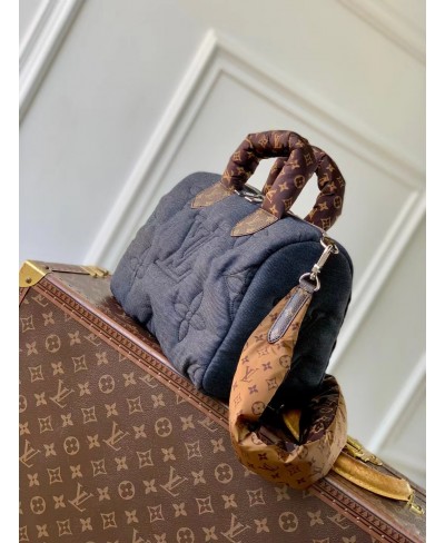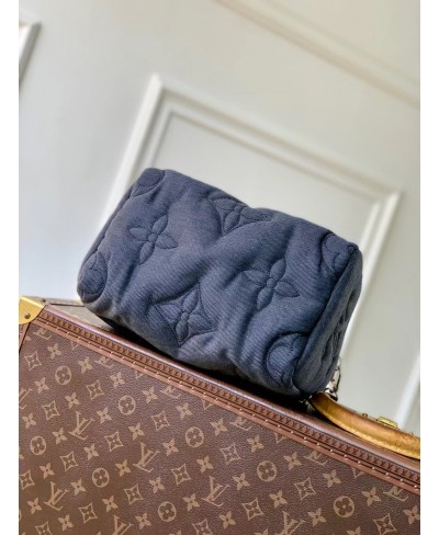 Questa edizione LV Ski dell'iconica Speedy Bandoulière 20 è realizzata in nylon Puffygram della Maison, imbottito e impermeabile per offrire vantaggi tecnici. Presenta una moderna colorazione Black Jeans, con manico e tracolla a contrasto decorati con il caratteristico Monogram della Maison. La forma compatta offre spazio sufficiente per riporre uno smartphone, un portafoglio Zippy e le chiavi, oltre al rossetto preferito.