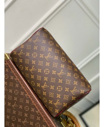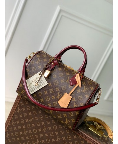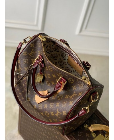 Pensata per i viaggi, il tema Persona della borsa Speedy Soft 30 fa parte della Collezione Monogram Anniversary, che celebra i 130 anni dell'iconico motivo di Louis Vuitton. Realizzata nell'emblematica tela della Maison con finiture in vacchetta, è impreziosita da un esclusivo porte adresse a commemorazione dell'anniversario e da un raffinato dettaglio celebrativo all'interno. Altri dettagli tipici del marchio includono un portachiavi, un lucchetto dorato e un charm a forma di carta d'imbarco.